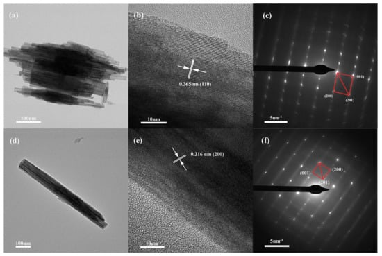 TEM, HRTEM, and SAED images of the two h-WO3 samples were analyzed (Figure 4). For the h-WO3 prepared with 1.4432 g Na2WO4 2H2O and 30 mL 0.25 mol L−1 H2SO4, nanorods can be clearly observed in the bundle-like particle (Figure 4a). The h-WO3 nanorods are composed of nanowires with a diameter of 10 nm and a length of around 150–450 nm. HRTEM imaging proves that a spacing of 3.65 Å can be assigned to the (110) plane of h-WO3 (Figure 4b). Figure 4c shows the selected electron diffraction pattern of h-WO3 nanobundles. The diffraction spots are in general agreement with the crystal planes (or their equivalent planes) (001), (200), and (201). For the h-WO3 prepared using 1.4432 g Na2WO4 2H2O, 20 mL 0.375 mol L−1 H2SO4, and 10 mL glycerol, nanorods with a length of 700 nm and diameter of 80 nm can be seen (Figure 4d). The nanorod is constructed with various nanowires that are about 10 nm in diameter and 700 nm in length. The lattice fringes are perpendicular to the nanorod axis and the distance of 3.16 Å coincides with the (200) crystal plane of h-WO3 (Figure 4e). Figure 4f shows the selected electron diffraction pattern of h-WO3 nanorods. Selected area electron diffraction pattern (SAED) indicates that the h-WO3 nanorod is a single crystal. The diffraction spots are in general agreement with the crystal planes (or their equivalent planes) (001), (200), and (201). The results are consistent with those of XRD and HRTEM above.