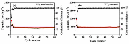 Cycle performances of WO3 nanostructures with different shapes at 500 mA g−1 in a voltage range of 0.01–3 V. (a) WO3 nanobundles, (b) WO3 nanorods.