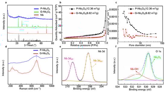 (a) XRD patterns; (b) adsorption-desorption isotherms of the P-Nb2O5 and particles of P-Nb2O5; (c) pore size distribution of the P-Nb2O5 and G-Nb2O5; (d) Raman spectra; (e,f) high-resolution XPS spectra of the C1s, O1s, and Nb3d peaks of the anodized niobium samples; (e) Nb 3d; and (f) O1s.