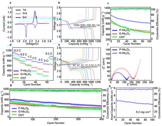 The cycling performances of the P-Nb2O5, G-Nb2O5, and CNT electrodes at 0.2 c are shown in Figure 5c. The initial discharge capacity of the P-Nb2O5 was 1106.8 mAh·g−1, indicating the good sulfur utilization of the electrode, with a capacity storage rate of 73.14% after 100 cycles. Compared to the granular Nb2O5 and CNT as the cathode mixing material, the battery that used the P-Nb2O5 as the mixing material for the positive electrodes showed excellent rate capability (Figure 5d,e) and delivered specific capacities of 1108.6, 1016.4, 892.6, 826.4, 753.4, and 713.4 mAh·g−1 at 0.2, 0.5, 1, 2, 3, and 5 C, respectively. The promoted rate capability of the P-Nb2O5 could be attributed to the porous nature, fast charge transfer, and rapid transport capabilities. When the rate returned to 0.2 C, the specific capacities of the batteries with the P-Nb2O5, G-Nb2O5, and CNT forms were 958.85, 655.01, and 870.70 mAh·g−1, respectively [30]. Electrochemical impedance spectroscopy on the batteries with the G-Nb2O5 and P-Nb2O5 electrodes was carried out, and the differences in the internal resistance were investigated, as shown in Figure 5f. The two Nyquist diagrams of the batteries in Figure 5f have the same shape, including a semicircle involving the charge transfer resistance (Rct) and a sloping line associated with the Li diffusion. The P-Nb2O5 had a lower charge transfer resistance (Rct = 117.6 Ω) compared to the G-Nb2O5, indicating that the P-Nb2O5 had the fastest charge transfer kinetics. To further investigate the status of the potential applications of the P-Nb2O5 cathode in practice, we explored the long cycle of the P-Nb2O5 and G-Nb2O5 cathodes, as seen in Figure 5g. The P-Nb2O5 cathode maintained a reversible capacity of up to 602 mAh·g−2 after 400 cycles at 1 C, with very high stability and discharge capacity compared to the G-Nb2O5 and CNT, which was primarily due to the redox reaction facilitated by the presence of the porous Nb2O5 and the suppression of the shuttle effect of the LiPSs. This demonstrated that the porous Nb2O5 could improve the reaction kinetics during the polysulfide reactions. In order to demonstrate the potential of the P-Nb2O5 for applications in LSBs, cycle performance tests were carried out on the LSBs with high sulfur loadings. As shown in Figure 5h, the electrode exhibited a high area capacity of 4.8 mAh·cm−2 at a high sulfur load of 5.2 mg·cm−2.