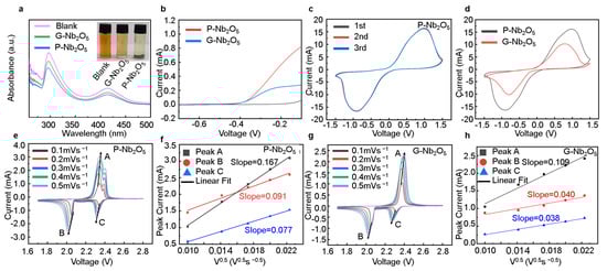 (a) UV-vis spectra and optical images of the P-Nb2O5 and G-Nb2O5 adsorbed LiPSs solutions. (b) Li2S oxidation LSV curve. (c) Symmetric battery cv curves for the P-Nb2O5. (d) Symmetric battery cv curves for the P-Nb2O5 and G-Nb2O5. (e,g) CV curves at different sweep speeds. (f,h) Linear regression line for peak A, peak B, and peak C.