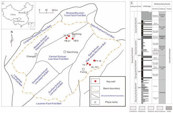 - Liu, Z.; Liu, G.; Hu, Z.; Feng, D.; Zhu, T.; Bian, R.; Jiang, T.; Jin, Z. Lithofacies types and assemblage features of continental shale strata and their implications for shale gas exploration: A case study of the Middle and Lower Jurassic strata in the Sichuan Basin. Nat. Gas Ind. B 2020, 7, 358–369. [Google Scholar] [CrossRef]
