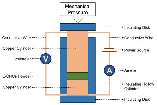 100 mg of the conductive CNCs in powder form were placed between two copper cylinders of the same cross-sections as shown in Figure 2. The powder was subjected to 1 ton of pressure and the conductivity of the CNCs was determined following the four-point method using two multimeters (UT33C+ Digital Multimeter, UNI-T, Dongguan, China). The following formula was used to calculate the electrical conductivity: