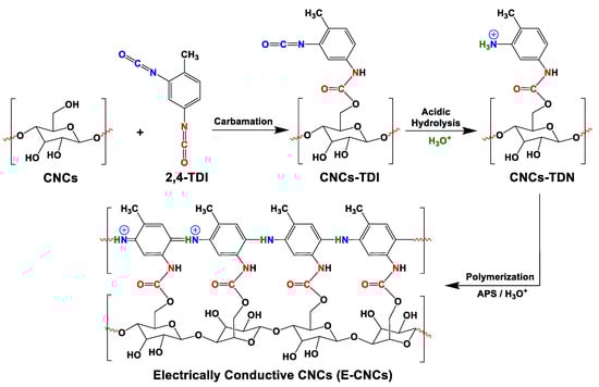 In several reports in the literature, cellulose and nanocellulose have been mixed with conductive polymers such as poly(aniline) to render them conductive. The products in these reports were mostly isotropic conductive composites, in which the cellulosic material acted merely as a non-functional substrate [23]. In this work, we aim to prepare novel electrically conductive cellulose nanocrystals (CNCs) by building up a poly(o-toluidine)-like shell on the CNC surface, making each CNC act as an individually-conductive nanowire. Such an engineered surface is expected to increase the potential of CNCs in major technological applications such as electronics and sensing. The development of the conductive shell around the CNCs started by the carbamation reaction between 2,4-TDI and the surface hydroxyls of the CNCs followed the method of Habibi, which was optimized and published by the authors elsewhere [47,48] (Figure 3). 2,4-TDI was used because of the known 5–10 times higher reactivity of its para isocyanate group compared to the ortho one [51,52,53]. Due to this difference in reactivity, the para isocyanate groups of 2,4-TDI were expected to react with the surface hydroxyl groups of CNCs whereas the ortho groups were to stay unreacted. This reaction was thoroughly optimized by the authors and published elsewhere [48]. The second step was the hydrolysis of the unreacted ortho isocyanates on the carbamated CNC (CNCs-TDI) surface using HCl-acidified DMSO to form ammonium chloride groups. This step was also optimized by the authors and published elsewhere [49]. After carbamation and hydrolysis, the surface of the CNCs was fully covered with toluidine-like molecules (CNCs-TDN), which were then polymerized using the oxidizing agent, APS, forming an electrically conductive poly(toluidine)-like shell around the CNCs leading to novel electrically conductive CNCs (E-CNCs) with a core-shell nanostructure.