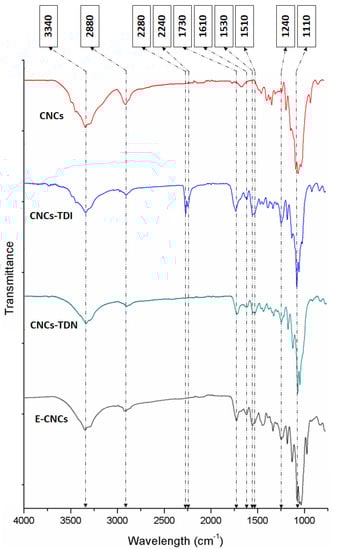 Samples of the CNCs at all stages of the process were characterized using Tensor 27 FT-IR spectrometer (Bruker, Billerica, MA, USA) in the 750–4000 cm−1 range (resolution of 2 cm−1) using the ATR transmission mode. The spectra were obtained as the average of 64 scans and processed using OPUS software (Version 6.5).
