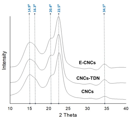 To confirm that the carbamation, hydrolysis, and polymerization reactions all took place on the surface of CNCs and not inside them, the CNCs were characterized before and after these processes using X-ray diffraction. The results showed that the CNCs had the native crystalline structure of cellulose (Cellulose I), which exhibits five diffraction peaks at 2θ of 14.8°, 16.3°, 20.4°, 22.4°, and 34.5° corresponding to the diffractions of the crystalline planes 101, 10-1, 021, 200, and 040 [56] (Figure 6). No Cellulose II crystalline structure was detected at 2θ of 12° indicating that no cellulose dissolution and regeneration took place. Using peak deconvolution, the crystallinity of the CNCs was determined based on the areas of the five diffraction peaks and the amorphous peak at 2θ of 18°. The results showed that the crystallinity slightly dropped from 90.2% ± 1.3% for the original CNCs to 87.2% ± 1.4% for the CNCs-TDN to 86.6% ± 1.6% for the E-CNCs confirming that the carbamation, hydrolysis, and polymerization reactions all took place on the CNC surface. If any of these reactions took place inside the crystal, they would have led to a significant drop in crystallinity in addition to a possible formation of Cellulose II crystals.