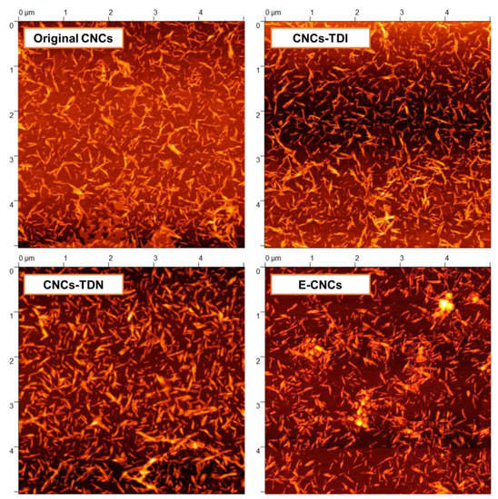 AFM topography images of the original CNCs, after carbamation using 2,4-TDI (CNCs-TDI), hydrolysis using HCl-acidified DMSO (CNCs-TDN), and after polymerization using APS (E-CNCs).
