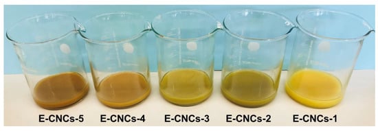 Finally, and most importantly, the electrical conductivity of the E-CNCs were measured using the four-point method as shown in Figure 2 and the impact of APS amount on the properties of the E-CNCs was investigated. The results showed that using an APS/TDN molar ratio of 1.25 (using 379 mg of APS) led to the highest electrical conductivity of 0.46 S/cm since this ratio was expected to lead to the formation of the emeraldine salt form of the polymerized TDN on the CNC shell, which is in agreement with the obtained green color (Table 2 and Figure 8). Using a lower amount of APS (304 mg, APS/TDN molar ratio of 1.00) led to the formation of the insulated yellow-colored leucomeraldine (E-CNCs-1) form whereas using higher amounts of 410 and more led to over-oxidation of the shell causing the brown color (E-CNCs-4 and E-CNCs-5). This brown color has been reported in the literature for over-oxidized poly(aniline) [57,58]. The conductivity values and colors are in agreement with the literature reports, which obtained the highest conductivity using an APS/TDN molar ratio of 1–1.25 [59,60].