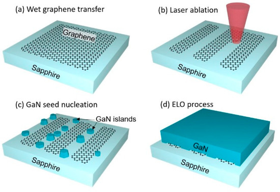 The key processes involved in the sample preparation are schematically illustrated in Figure 1. Four main steps can be identified: (a) transfer of monolayer graphene onto the sapphire substrate by the wet transfer; (b) laser ablation of graphene; (c) nucleation of GaN seeds; and (d) epitaxial lateral overgrowth of GaN film.