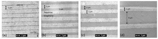 Several patterns with different distances between graphene windows were fabricated, as shown in SEM images in Figure 4. The pattern orientation was along the direction of the sapphire substrate. The areas without graphene revealed undamaged sapphire, even though some ablation debris could be spotted. The thinnest obtained graphene stripes were 200 nm wide; however, the stripe width was highly uneven [see Figure 4a]. The evenness slightly improved for thicker stripes with the standard deviation of stripe width of 50 nm. Nevertheless, the overall pattern showed a nice periodic structure with repeating stripes.