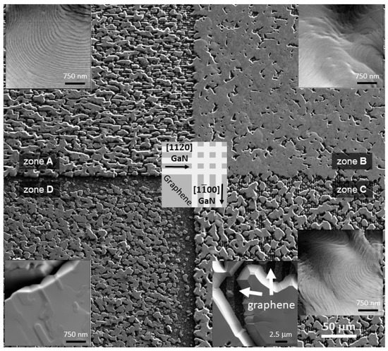 For the following ELO of GaN epilayers, the graphene layer was divided into four quadrants (zones A-D, as illustrated in Figure 5), and periodic patterns were fabricated in three of them. The periodic structure consisting of alternating graphene stripes and windows, both having the width of 2 µm and running along the direction was fabricated in zones A and B. Analogous periodic structure but running along the direction was fabricated in zones B and C. Since both structures intersected in zone B, it resulted in square graphene islands with a side length of 2 µm. A single quadrant (zone D) was kept with unmodified graphene as a reference. The obtained graphene pattern is schematically illustrated in Figure 5.