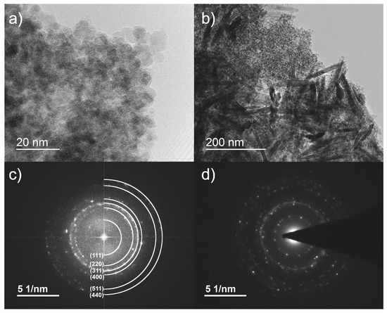 (a) High-resolution transmission electron microscopy image of iron oxide nanoparticles, (b) High-resolution transmission electron microscopy image of goethite nanowires, (c) FFT pattern of magnetite/maghemite nanoparticles calculated from (a,d) Selective area electron diffraction pattern of goethite nanowires.