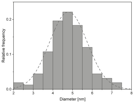 Nanoparticle size distribution for all doses. The dashed line shows a normal distribution fit ( nm, nm).