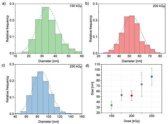 Cluster size distribution with normal distribution fit (dashed line) at (a) 150 kGy, (b) 200 kGy and (c) 250 kGy and (d) cluster size depending on irradiation dose.