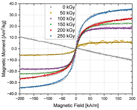 Magnetic moment depending on the applied magnetic field. The graphs from 50 kGy to 250 kGy are corrected for the diamagnetic part. The sample volume was 15 µL. The black dashed lines show a Langevin fit (Equation (4)) to each of the associated curves.