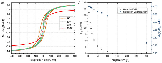 For temperatures below 70 K, the magnetization curves start to show typical hysteresis loops (Figure 7a). The coercivity and the saturation magnetization increases with decreasing temperatures (Figure 7b).