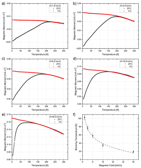Zero-field cooling and field cooling curves of the 200 kGy sample for applied magnetic fields of (a) 1.6 kA/m, (b) 4 kA/m, (c) 8 kA/m, (d) 16 kA/m and (e) 40 kA/m. (f) Blocking temperature depending on the applied field. The dashed line shows a fit based on Equation (11) leading to an effective anisotropy constant of kJ/m.