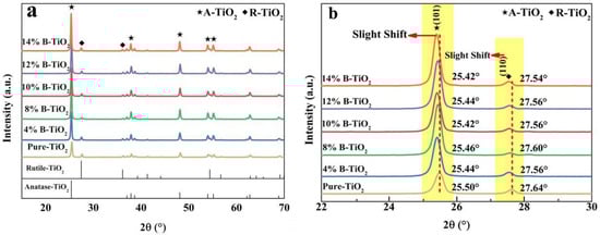 Figure 1a shows the phase composition of the prepared samples. For all samples, only peaks ascribed to rutile TiO2 (R-TiO2) (PDF 76-1938) and anatase TiO2 (A-TiO2) (PDF 83-2243) can be detected without the appearance of other phases [,]. Furthermore, from the magnified XRD patterns (Figure 1b), the (101) diffraction peak of A-TiO2 and (110) diffraction peak of R-TiO2 show an obvious shift to the lower 2θ value with increasing introduced boron content. Because the B3+ cations (27 pm) are smaller than the Ti4+ cations (60.5 pm), the resulting lattice shrinkage would cause the gradual shift of the diffraction peaks []. Therefore, these results indicate the successful introduction of boron into TiO2 and the substitution of B3+ in the crystal lattices of TiO2. In addition, the weight ratios of the R-TiO2 to A-TiO2 are calculated to be 0.1, 0.09, 0.05, 0.04, 0.06, and 0.07, respectively.