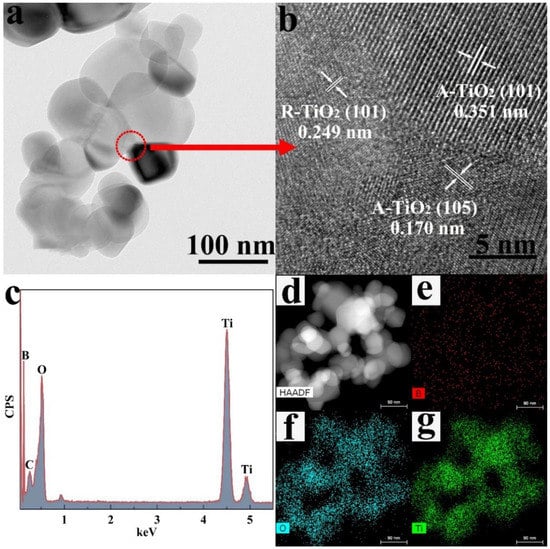 (a) Low-resolution TEM images, (b) high-resolution lattice images, (c) EDS, (d) HAADF and EDS elemental mapping images of (e) B, (f) O, (g) Ti for the sample 10% B-TiO2.