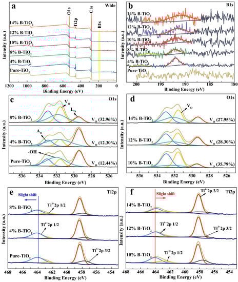 XPS analysis was applied to find out the concentrations of defect states (oxygen vacancy) of TiO2 after the introduction of B (Figure 4). In the survey spectra (Figure 4a), besides the C calibration element, B, O, and Ti elements are detected for all the samples. Figure 4b shows the XPS spectra of B1s, in which a broad peak, centered at around 191 eV ascribed to a substitutional B that occupies O sites, can be observed for B-doped samples []. This result proves the successful incorporation of B into the TiO2 lattice. In Figure 4c,d, four peaks centered at 529.5, 531.5, 532.1, and 532.9 eV, corresponding to lattice oxygen (LO), Ti-O in Ti2O3, a surface adsorbed -OH group, and adsorbed H2O (AO) [,] can be observed in O1s spectra, respectively. In particular, the presence of peaks centered at 531.5 eV is believed to be caused by partially reduced Ti atoms in TiO2, due to the connection with neighboring oxygen vacancies (Vo), which suggests the existence of Vo [,]. Moreover, the increase in its peak intensity indicates that the Vo content in the samples increases with the increasing content of the B-dopant []. Moreover, the content of Vo can be obtained by using the CasaXPS analysis software based on the area-calculation of the fitted peaks, and the result is shown in Figure 4c,d. As can be seen, the ratio of the area under the VO XPS peak (visible at around 531.5 eV) in 10% B-TiO2 is the highest, signifying the presence of the highest amount of oxygen vacancies. It can be deduced that the boron in the crystal lattices may reach the highest amount of incorporation, and this sample may show distinct photodegradation activity due to the adjusted band structure. Furthermore, the Ti2p spectra are fitted into four peaks, i.e., 458.3 eV (Ti4+ 2p 3/2), 457.3 eV (Ti3+ 2p 3/2), 464.0 eV (Ti4+ 2p 1/2) and 462.3 eV (Ti3+ 2p 1/2), respectively []. Moreover, it can be seen that Ti2p peaks (Figure 4e,f) slightly move towards the higher binding energy region from pure-TiO2 to 10% B-TiO2, then shift towards the lower binding energy region from 10% B-TiO2 to 14% B-TiO2, indicating the variation of Vo contents with a high electron-attracting effect [,]. The presence of Ti3+ peaks and the shift further confirm the presence of Vo in all samples and the highest amount of Vo in 10% B-TiO2.