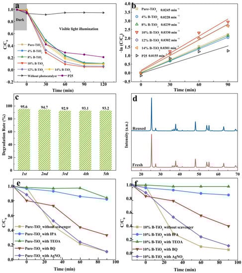 The RhB photodegradation of the catalysts under simulated sunlight illumination is shown in Figure 5, with commercial P25 and RhB solutions lacking the presence of catalysts as references. No obvious removal of RhB can be observed for the solution without the presence of catalysts. Ten percent B-TiO2 shows the highest RhB degradation rate of 94.8% after light illumination for 90 min. The increase in boron doping from 4% B-TiO2 to 10% B-TiO2 prompted photodegradation activity. However, for the 12% B-TiO2 and 14% B-TiO2 samples, a significantly decreased degradation efficiency can be observed. From the analysis of degradation kinetics in Figure 5b, the degradation rate with 10% B-TiO2 was 0.033 min−1, 2.13 times higher than commercial P25. As is known, the chemical stability of photocatalysts plays a crucial role in the application []. The cycling test result of the 10% B-TiO2 sample is shown in Figure 5c. No obvious deduction (less than 2%) can be observed after five cycles, suggesting that the photocatalyst is relatively stable. From the XRD analysis in Figure 5d, by comparing the position and shape of diffraction peaks, no detectable differences can be seen between the as-prepared and cycled 10% B-TiO2, indicating a well-preserved crystalline structure of the catalyst after multiple photocatalytic cycles. Moreover, a few studies on RhB photodegradation performance of TiO2-based photocatalysts are summarized in Table 1. The table shows that the degradation efficiency of RhB over the catalyst prepared in this work was markedly improved, indicating that the prepared B-doped TiO2 is a promising photocatalyst for RhB degradation.
