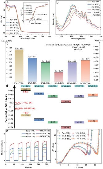 From the PL spectra (Figure 7b), the samples show similar emission peaks at around 400 nm. The 10% B-TiO2 sample shows the lowest intensity, indicating an enhanced charge separation for 10% B-TiO2 with optimized boron doping []. Furthermore, the TP response and EIS results are shown in Figure 7e,f. The same trend (firstly increasing and then decreasing) of the TP response and the radicals in EIS can be observed with increasing B-dopant. Especially, the 10% B-TiO2 sample shows the highest photocurrent response and the minimum radicals in EIS, which can result from the highest content of oxygen vacancy defects []. The above results are consistent with the XPS and photocatalysis degradation studies. In general, it can be concluded that B-doping can adjust the content of oxygen vacancies, and then mediate the band structure to enhance the photocatalytic performance.