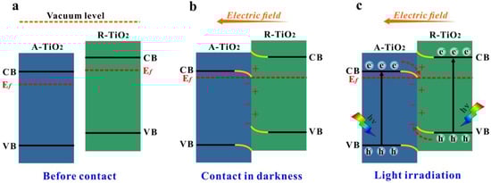 Schematic illustration of formation and charge-transfer processes in the Z-scheme heterojunction of B-doped A-TiO2/R-TiO2: (a) before contact, (b) after contact, (c) photogenerated charge carrier transfer process in Z-scheme mode.