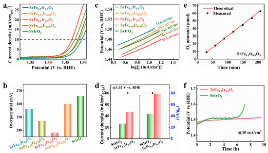 Figure 3d shows the content of different oxygen species in which the content of oxygen vacancies or hydroxyl groups in SrFe0.1Ir0.9O3 is about 20% higher than that of SrIrO3, thus facilitating oxygen species absorption/desorption [30,31,32]. For some compounds, these vacancies are related to the overall catalytic performance. For instance, oxygen vacancies appear when the host and guest atoms have different oxidation states in SrFeO3 [33]. Most perovskite materials have a propensity for oxygen vacancies due to solid-phase methods at high temperatures, which leads to the distortion of the oxygen octahedron [34]. The oxygen deficiency is closely related to the bond covalency of M−O and catalytic activity. From the perspective of the adsorption evolution mechanism, the increase in covalency leads to an increase in the electron density of the Ir site and a decrease in the electrostatic interaction with the oxygen intermediate species, thus weakening the binding energy of Ir to the oxygen intermediate species [35,36,37].