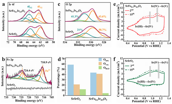 (a) Ir 4f, (b) Fe 2p, and (c) O 2p XPS spectra of SrIrO3 and SrFe0.1Ir0.9O3. (d) Result of O 1s orbital XPS spectra of SrIrO3 and SrFe0.1Ir0.9O3. The cyclic voltammetry (CV) curves recorded at the 2nd and 15th cycles for (e) SrIrO3 and (f) SrFe0.1Ir0.9O3.