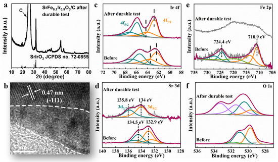 (a) XRD pattern of SrFe0.1Ir0.9O3/C after a 10 h durability test, (b) HRTEM image of SrFe0.1Ir0.9O3 after a 10 h durability test. (c) Ir 4f, (d) Sr 3d, (e) Fe 2p, and (f) O 2p XPS spectra of SrFe0.1Ir0.9O3 before and after 10 h durability test.
