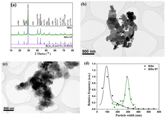 XRD patterns of Bi2Se3 nanoparticles synthesized hydrothermally (BiSe) and solvothermally (BiSe ST) (a). Representative TEM image of BiSe (b) and BiSe-ST (c) nanoparticles, and the corresponding size distribution (d), obtained from TEM images.