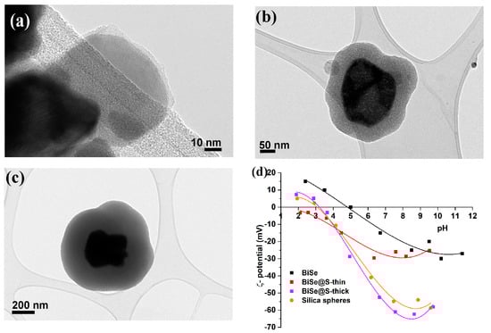 Figure 2 shows the BiSe nanoparticles subsequently coated with (a) a thin ≈ 2–5 nm, (b) an intermediate ≈ 50–80 nm, and (c) a thick ≈ 200 nm uniform silica layer covering the individual nanoparticles. An additional confirmation that the silica coating was successful was the change in the point of zero charges (PZC). Figure 2d shows the zeta potential (ζ) of the silica-coated BiSe nanoparticles compared to the uncoated ones and silica nanospheres synthesized using a modified Stober process [64]. The PZC decreased from pH = 5 (BiSe) to ≈2.5 for BiSe@S-thin and ≈3 for BiSe@S-thick.
