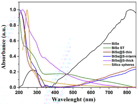 In our previous work [7], we demonstrated that an EG layer, adsorbed on the surface of the Bi2Se3 nanoparticles, can mask/impair the optical properties derived from TSS. Namely, BiSe-ST nanoparticles display absorption peaks in the range of ≈200–350 nm and ≈350–550 nm. Near the IR region, the absorbance decreases without showing absorption peaks [7]. On the contrary, the absorption spectrum of BiSe nanoparticles in the spectral range of ≈200–300 nm is very similar to that of BiSe-ST. However, a striking difference can be observed at higher wavelengths, where BiSe nanoparticles display an intense and broad adsorption peak over the entire measured range. This broad peak can be ascribed to LSPR, which results from TSS [5]. Figure 3 shows the normalized UV-Vis absorption spectra of the silica-coated Bi2Se3 nanoparticles compared to their BiSe and BiSe-ST counterparts. Normalization of UV-Vis spectra was used to qualitatively evaluate the impact of the coating layer on the optical properties of the Bi2Se3 nanoparticles. The BiSe@S-thin and BiSe@S-interm samples displayed similar absorption spectra to the BiSe nanoparticles over the entire measuring area. They showed absorption peaks in the spectral range ≈ 210–300 nm, where both BiSe and pure silica spheres adsorb. At a higher wavelength, they showed a broad adsorption peak, dominating over the whole measured spectral region from ≈380 to 850 nm, which can be ascribed to the LSPR resulting from TSS. The only difference in the adsorption of BiSe@S-thin and BiSe@S-interm compared to the BiSe sample was a less pronounced absorption peak in this region, which can be attributed to the silica coating. However, the results suggest that the thin (≈2–5 nm) and intermediate (≈50–80 nm) silica layers did not mask the optical properties derived from TSS. With the increase in the silica layer thickness, the absorption spectrum also changed. In the spectral range from ≈200–350 nm, the BiSe@S-thick sample displayed absorption spectra very similar to the BiSe, BiSe@S-thin, and BiSe@S-inter samples. Towards higher wavelengths, the absorption of the BiSe@S-thick sample decreased, similarly to the case of the BiSe-ST sample.