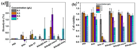 Nanoparticles for biomedical applications must be non-toxic. Figure 5a shows the hemotoxicity of the samples. The mixed-effect ANOVA test, which compared samples with the PBS (negative control), showed that the hemolysis effect was significantly higher for BiSe@S-interm at 0.3 and 0.5 g/L. However, at a concentration of 1 mg/mL for the same sample, the hemolysis was found to be 0.3%. Therefore, this discrepancy falls within the range of experimental method error, and we can conclude that the sample did not cause significant hemolysis. In all cases, the determined hemolysis was lower than 2%, which falls within the error area of the method and indicates that neither the BiSe and BiSe-ST nor silica coated Bi2Se3 nanoparticles were hemotoxic under the given conditions.