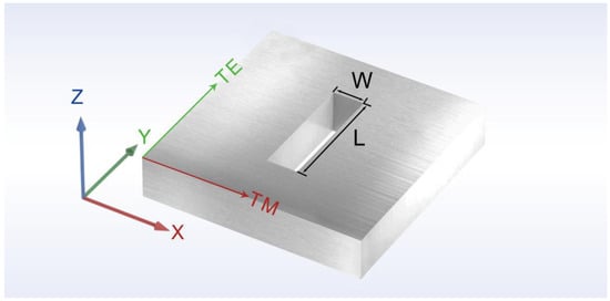 The numerical model of the single rectangular slot. The length and width of a single rectangular slot are L and W. The thickness of the aluminum film is 200 nm. The electric vector of the TM polarized light was along the x-axis, and the electric vector of the TE polarized light was along the y-axis.