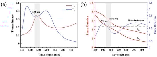 where the two elements of the subdiagonal are 0, indicating that there is no linear polarization transition effect. The two elements of the main diagonal need to satisfy equal amplitudes and a phase difference of π/2. When double orthogonal rectangular slots have the dimensions L1 = 258 nm, W1 = 136 nm, L2 = 338 nm and W2 = 56 nm, they realize the same transmittance and phase difference of π/2. Subsequently, the property of the double orthogonal rectangular slots array at this size is verified with the time-domain finite-difference method (FDTD). Figure 4a,b shows the transmittance and phase mutation of the TM and TE linear polarized light of the double orthogonal rectangular slots array. The bandwidth of the TM and TE linear polarized light with a transmittance difference within 10% is 526–558 nm, and the bandwidth of the TM and TE linear polarized light with a phase difference of π/2 within 10% is 523–540 nm. Especially at the target wavelength of 532 nm, the transmittance is the same and the phase difference is approximately π/2, so the double orthogonal rectangular slots array at this size realizes the performance of a quarter-wave plate. Meanwhile, the simulation results also demonstrate that the coupling between the double orthogonal rectangular slots has a small effect on its performance.