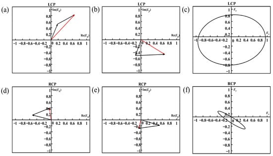 Simulation of design ideas. (a,b) The two black vectors represent the left-handed circularly polarized light passing through the double orthogonal rectangular slots array and the spatially π/4 tilted arrangement of the rectangular slot array, and their respective components of the emitted light in the x and y directions; the red vectors represent their sum vectors. (c) The Ey and Ex at different times (under the left-handed circularly polarized light) (d,e) The two black vectors represent the right-handed circularly polarized light passing through the double orthogonal rectangular slots array and the spatially π/4 tilted arrangement of the rectangular slot array, and their respective components of the emitted light in the x and y directions; the red vectors represent their sum vectors. (f) The Ey and Ex at different times (under the right-handed circularly polarized light).