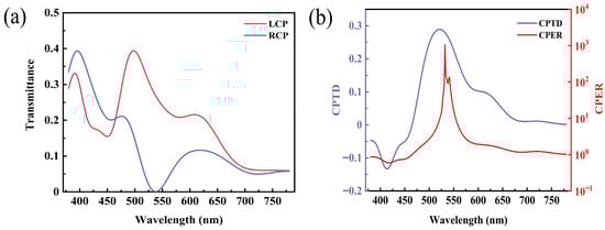 To verify the performance of the SCPMs at the above-mentioned dimensions, simulations for the full visible band are performed. The transmittances of the right-handed and left-handed circularly polarized light are given in Figure 7a. The circular polarization transmittance difference and circular polarization extinction ratio are given in Figure 7b. Briefly, the circular polarization transmittance difference of the SCPMs is greater than 0.1 in the wavelength range of 478–609 nm, whereas the circular polarization transmittance difference reaches 0.28 at a wavelength of 532 nm. Moreover, the circular polarization extinction ratio is greater than 10 in the wavelength range of 521–553 nm and reaches approximately 1000 at a wavelength of 532 nm.