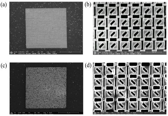 Focused ion beam (FIB) is utilized to process micro and nano structures and uses a focused beam of ions (e.g., gallium, helium, neon) to sputter atoms away from a sample surface to form a desired nanostructure. For the structural form of the SCPMs, the sample is fabricated with the thermally evaporated deposition technique and focused ion beam system. First, the SiO2 substrate is pretreated with operations such as cleaning. Then, a 200 nm-thick aluminum film is deposited on a pretreated SiO2 substrate using the thermally evaporated deposition technique. Finally, the designed chiral patterns are milled in the aluminum film using the focused ion beam system. The size of the fabricated structure array area is 20 × 20 µm. There are two main process parameters for focused ion beam: voltage (30 Kv) and ion beam current (41 pa), where the ion beam current corresponds to the beam spot diameter. The geometric features of the samples are characterized with scanning electron microscopy (SEM). Figure 8a,c shows the SEM images of the left-handed and right-handed structures. Figure 8b,d shows the SEM partial images of the left-handed and right-handed structures.