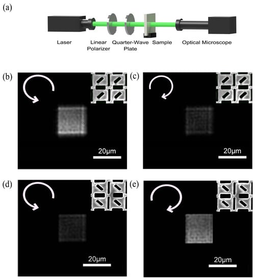 Experimental test instrumentations are set up to test the optical properties of the fabricated samples (Figure 9a). In the experiment, the linear polarized light with a wavelength of 532 nm emitted by the laser is converted to circularly polarized light by combining a linear polarizer and a quarter-wave plate. Here, the fast axis of the quarter-wave plate is at an angle of ±π/4 to the polarization direction of the linear polarizer and then irradiated normally onto the sample. Next, the transmission intensity distribution of the sample is collected using an optical microscope followed by the acquisition of grayscale images of the SCPMs under left-handed and right-handed circularly polarized light illumination. Figure 9b,c shows the grayscale images of the sample of the left-handed structures under the left-handed and right-handed circularly polarized light. Figure 9d,e shows the grayscale images of the sample of the right-handed structures under the left-handed and right-handed circularly polarized light.