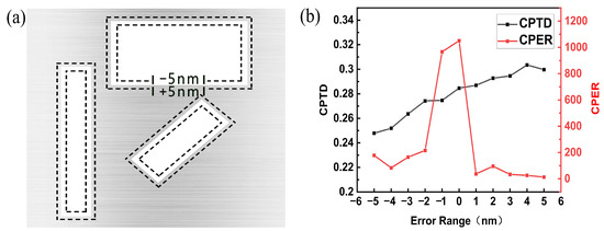 The experimental and simulated results do not correspond well, mainly related to two reasons. On the one hand, this may have resulted from a sample fabrication error, including the dimensional error of the rectangular slots and the surface topography error of the aluminum film. The processing error range of the focused ion beam system used to fabricate the sample is ±5 nm; a schematic representation of the basic cell structure within the ±5 nm dimensional error range is shown in Figure 11a. Figure 11b shows the simulated optical properties of the SCPMs with the dimensional error of the rectangular slots. As can be observed, the dimensional error of the rectangular slots has a significant impact on the performance of the SCPMs. The circular polarization transmittance difference and circular polarization extinction ratio of the SCPMs are reduced by an average of 2 and 82.7%, respectively, with the lowest circular polarization transmittance difference and circular polarization extinction ratio reaching 0.24 and 13, respectively.