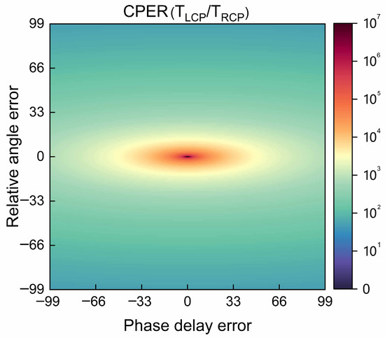 The relative angle error is ±0.035 rad, and the phase-delay error is ±0.27 rad. Figure 12 shows the effect of the relative angle error and phase-delay error on the measurement results of the circular polarization extinction ratio, and the lowest circular polarization extinction ratio is 50.08. As can be observed, the relative angle error and the phase-delay error have a significant impact on the performance of the SCPMs.
