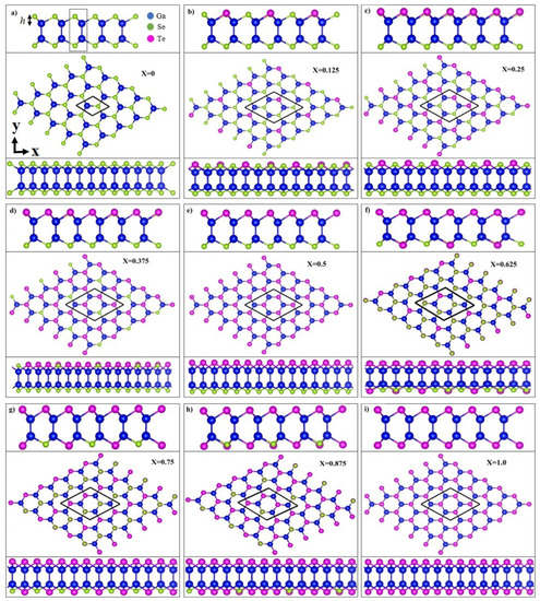 To ensure the study is systematic, nine monolayer GaSeTe compositions are considered, including two binary pristine systems, namely GaSe () and GaTe (), and seven ternary ones (x = 0.125–0.875). After structural relaxation, these compositions reached their equilibrium conditions and exhibited the similar honeycomb lattice structures, as shown in Figure 1a–i. The structure consistency results in a regularly decreasing with an increase in x (Table 1). The middle panels, as viewed from the top, exhibit a honeycomb structure, and the upper/lower side views reveal a buckling structure along the zigzag (x-)/armchair (y-) direction. Each monolayer system comprises four atomic planes, which are all covalently bonded. The various geometric parameters are listed in Table 1, including the Ga-Ga/Ga-Se/Ga-Te bond length and buckling height h. The buckling height h is determined by the position difference along the z-axis between the nearest neighboring Se and Ga (Te and Ga) atoms, as illustrated in Figure 1a. The structural deformation after introducing the Te atoms was significant, as reflected in the large fluctuations in bond lengths and buckling heights. The Ga-Ga, Ga-Se, and Ga-Te bond lengths in the ternary alloys are 2.425–2.484, 2.451–2.483, and 2.606–2.637 Å, respectively, which are slightly larger than that of Si-Si in silicene and almost equal to that of Ge-Ge in germanene [38]. Notably, two bond lengths of Ga-Ga/Ga-Se/Ga-Te coexist in most configurations except . In , the Se and Te atoms are located on the opposite sides of the Ga atoms, and therefore the Ga-Ga/Ga-Se/Ga-Te bond length becomes unique. Additionally, at a low or moderate concentration, i.e., –0.625, the buckling height is dependent on the atom site. The smaller the x is, the wider the range of h obtained. The bond length is not monotonically dependent on x. However, the average buckling height generally increases with theincreasing x. The multiple and x-dependent bond lengths and buckling heights are attributable to the competition between Se and Te atoms. Differences in their atom sizes and electronegativities result in nonuniform chemical environments and enrich the orbital hybridizations among the Ga-(, , , ), Se-(, , , ), and Te-(, , , ) orbitals. Specifically, the increased buckling height enhances the nonorthogonality of the and bondings, leading to more prominent hybridizations. All the systems exhibit a semiconducting property. The band gap calculations with PBE and HSE06 hybrid functional are listed in the second-last and last columns in Table 1, respectively. Although a difference in band gap exists between PBE and HSE06 calculations, the trend in the band gap change is the same when the Te-concentration is increased.