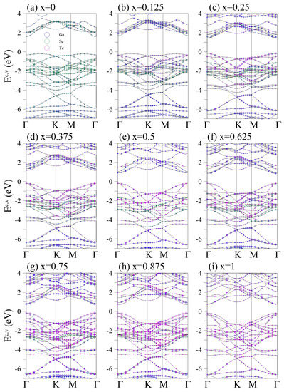 Two-dimensional band structures of the GaSeTe alloys for different x in (a–i). The Ga-, Se-, and Te-atom contributions are represented by the blue, green, and magenta circles, respectively.