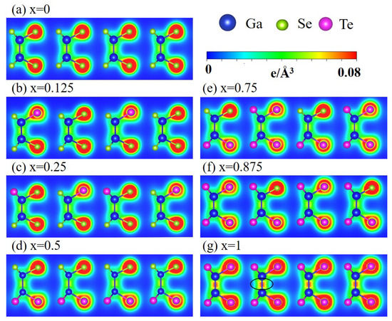 Spatial charge distributions of the GaSeTe alloys for different x in (a–g). The Ga, Se, and Te atoms are represented by the blue, green, and magenta balls, respectively. The plane (1 1 0) was used to cut through the unit cell.