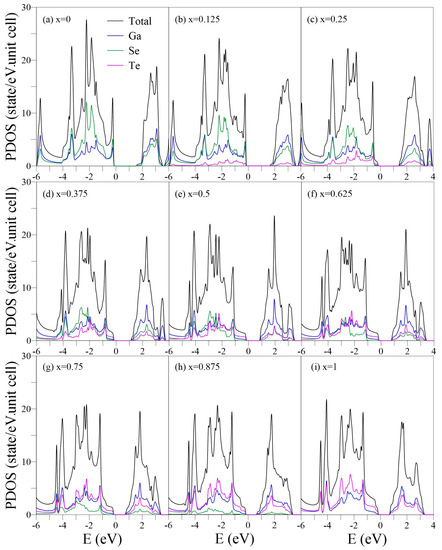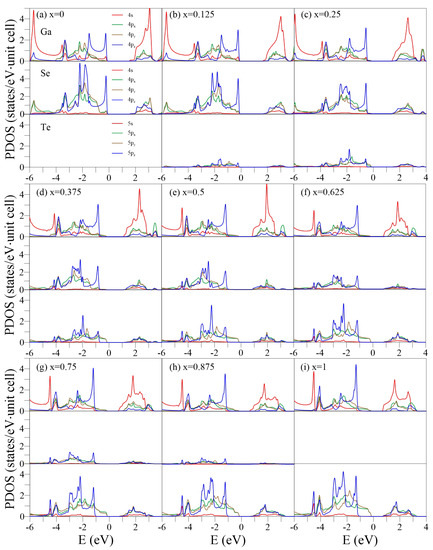 PDOSs of the GaSeTe alloys for –1 in (a–i). In each case, the up, middle, and low panels represent the Ga-, Se-, and Te-PDOSs, respectively.