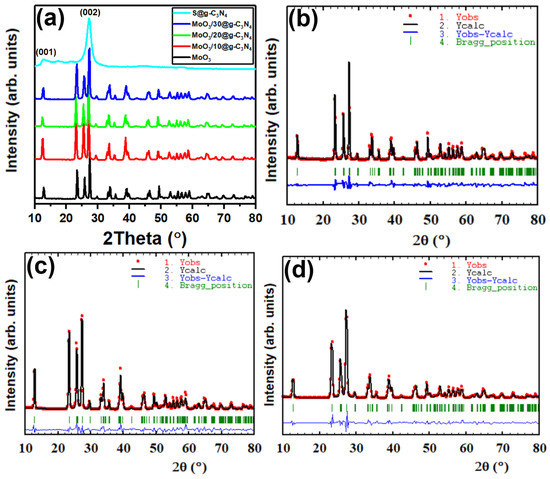 (a) XRD diffraction patterns of graphitic carbon nitride S@g-C3N4, MoO3, and MoO3/S@g-C3N4 nanocomposites with varying g-C3N4 concentrations. (b–d) Rietveld refinement of XRD patterns of MoO3, MoO3/10%S@g-C3N4, and MoO3/30%S@g-C3N4, respectively.