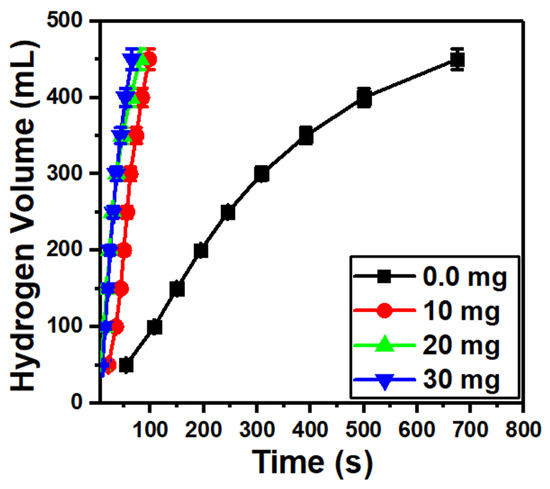 Figure 7 shows a fast hydrogen generation as the MoO3/10%S@g-C3N4 loading is increased from 0.0 to 30 mg. This may be due to the wide energy gap of the MoO3/10%S@g-C3N4 catalyst, which possesses a high separation of charge carriers [59]. Moreover, the amino group from S@g-C3N4 that is coated on the surface of MoO3 motivates the hydrogen production from NaBH4.