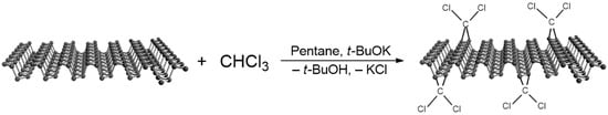 The BPNS were obtained by the sonication-assisted liquid-phase exfoliation method in N–methylpyrrolidone (NMP). Chemical functionalization of BPNS with dichlorocarbene was performed by slow addition of a suspension of BPNS in chloroform to a suspension of potassium tert-butoxide in pentane (Figure 1). After functionalization, the obtained material (BP–CCl2) was washed several times with water and isopropanol, dried in vacuo, and stored under a nitrogen atmosphere. The functionalized material was then characterized by various microscopic and spectroscopic methods.