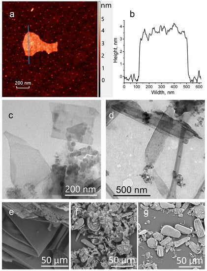 The morphological characteristics of the BPNS before and after functionalization were determined by scanning electron microscopy (SEM), transmission electron microscopy (TEM), and atomic force microscopy (AFM) methods. As shown in the AFM and TEM images (Figure 2), the exfoliated BP particles exhibit sheet-like morphology with uniform thickness and lateral size ranging from 100 to 600 nm. The thickness of BPNS estimated by the AFM method varied from 3 to 4 nm, which corresponds to 5–7 phosphorene layers. The SEM and TEM images of BP–CCl2 showed the retention of a sheet-like morphology and crystallinity in the functionalized material.